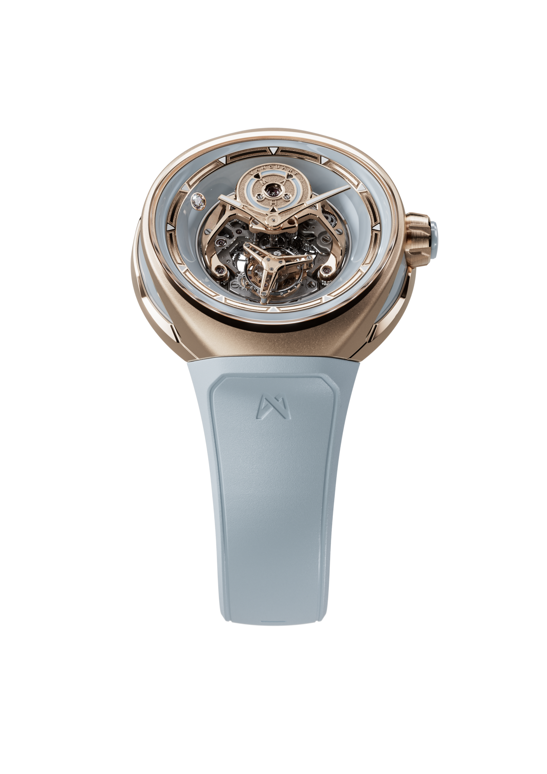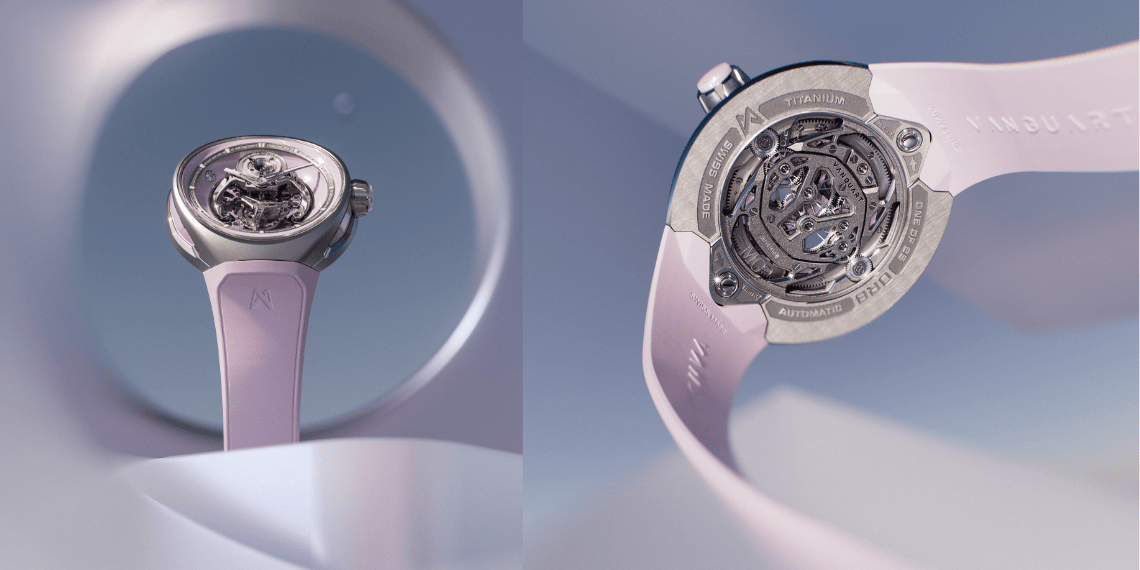 وترتقي كلتا النسختين بمفهوم التشطيب الفائق الذي تشتهر به Vanguart إلى مستوى أكثر جرأة. ففي الإصدار الوردي، خضعت الصفيحة الرئيسية المعالجة بآلية التنظيف بالرمل إلى تقنية الطلاء المعتمدة على الترسيب الفيزيائي للبخار بلون وردي أكثر عمقاً، ثم أعيد تشكيل زاويتها يدوياً لتكشف عن الطبقة السفلية المصقولة من التيتانيوم، في تلاعبٍ مدروس بين السطح والجوهر. أمّا الجسر الذي يثبّت أسطوانة النابض وقفص التوربيون في النسخة الزرقاء، فيتألقان بطبقة ذهبية معالجة وفق تقنية الترسيب الفيزيائي للبخار، ما يضفي عليهما جاذبية لونية آسرة. ويجسّد هذا التطور في التشطيبات النهائية التزام العلامة الراسخ بفنون صناعة الساعات الراقية.